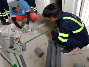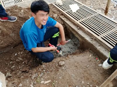 Les finitions ... avec le menuisier du village et l'appui des jeunes élèves plombiers du centre de formation professionnel (NVTC) créé par SOLU^CHAM.