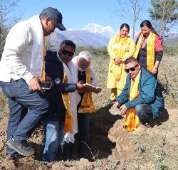Cérémonie bouddhiste de pose de la première pierre en décembre 2022 en présence de Nino Quaranta, Nima Sherpa (association SCAA) et de monsieur le maire de Salleri